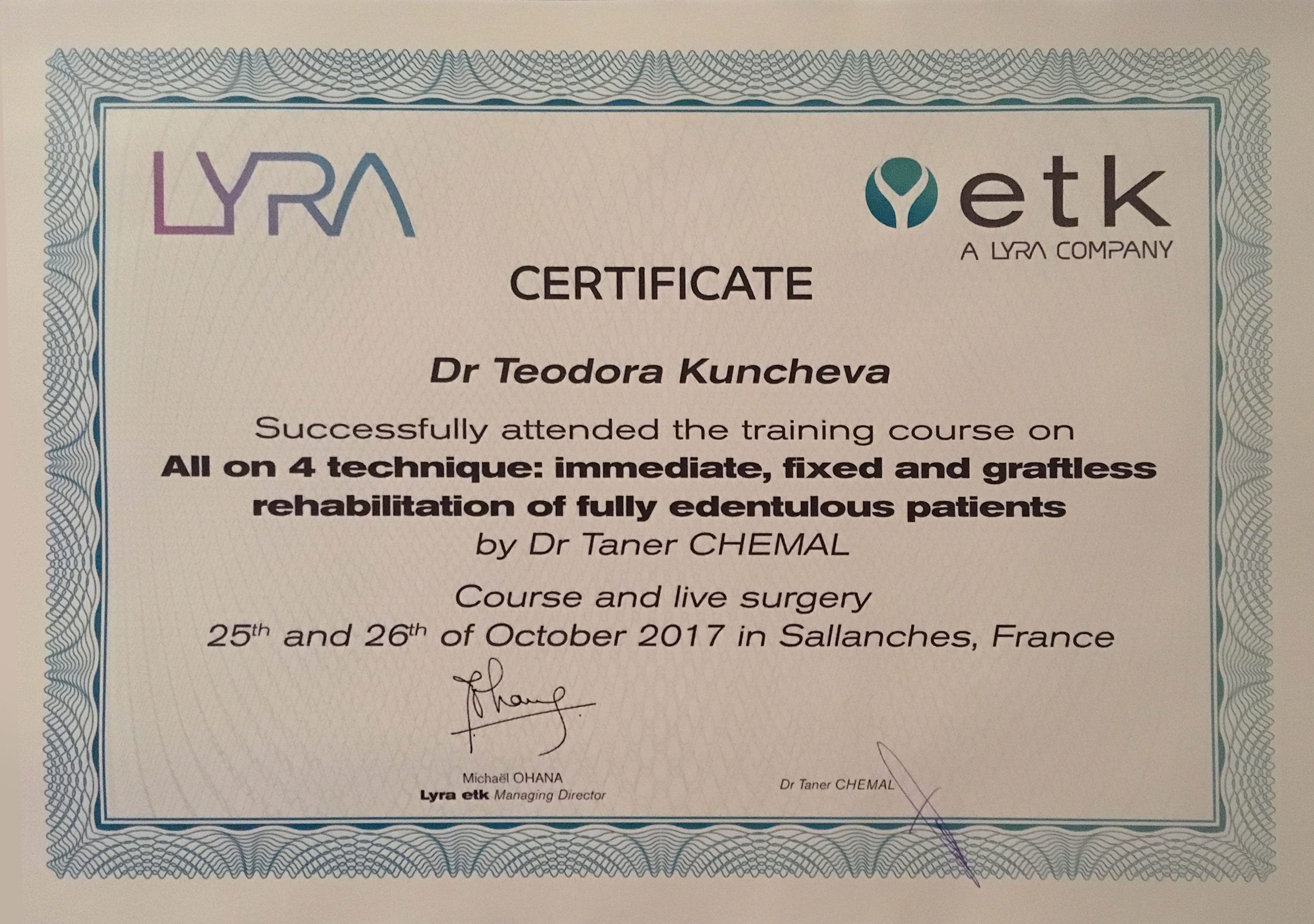 28 Oct 2017 in: News Dr. Nedialkova completed an “All in 4 Technique: Immediate, fixed and graftless rehabilitation of fully edentulous patients” course organised by Dr. Taner Chemal in Sallanche, France. Споделете тази публикация Post navigation Sofia Dental MeetingKulzer Product Training
